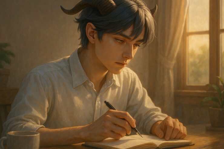 本を閉じ、語りかけるように微笑む青年アルジの読書風景(A young man named Aruji closing a book with a soft gaze, ready to share his thoughts)
